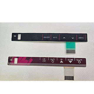 應用於電熱電器(如熱壓機、烤箱或捲髮棒)的薄膜按鍵面板 (Membrane Switch)。